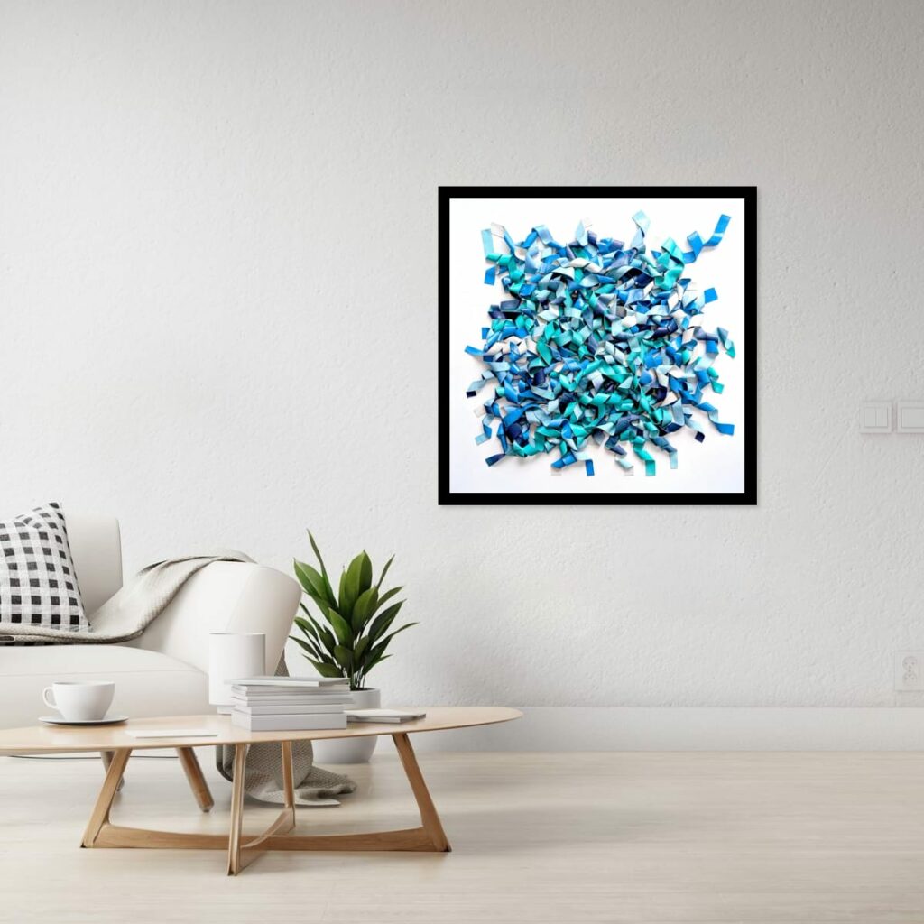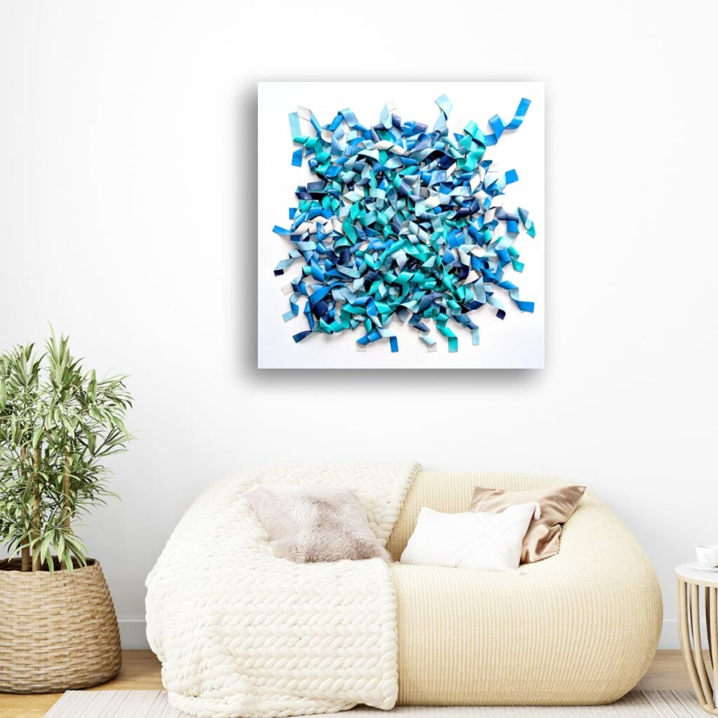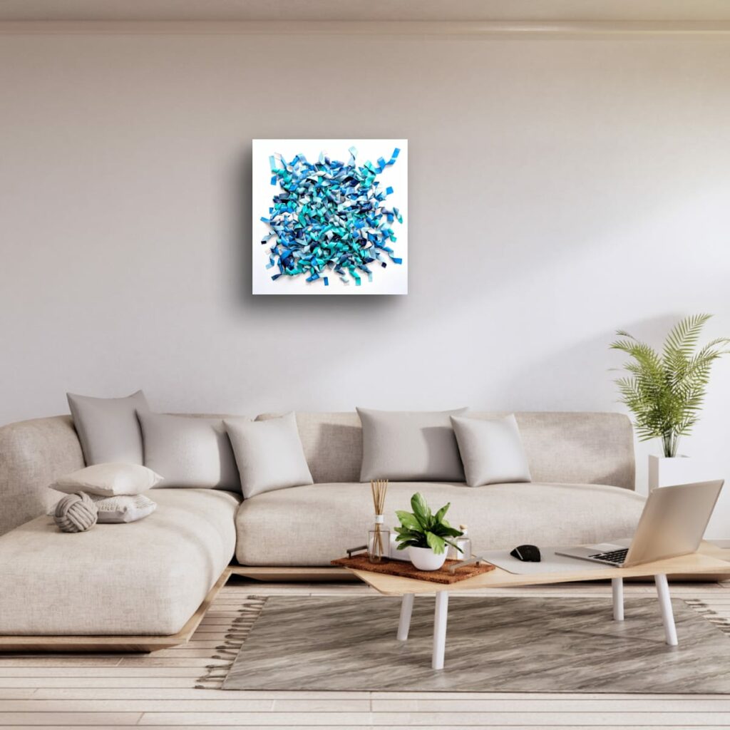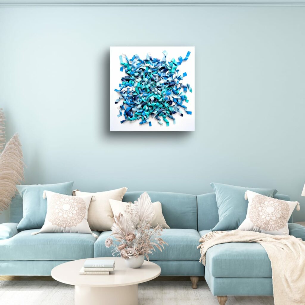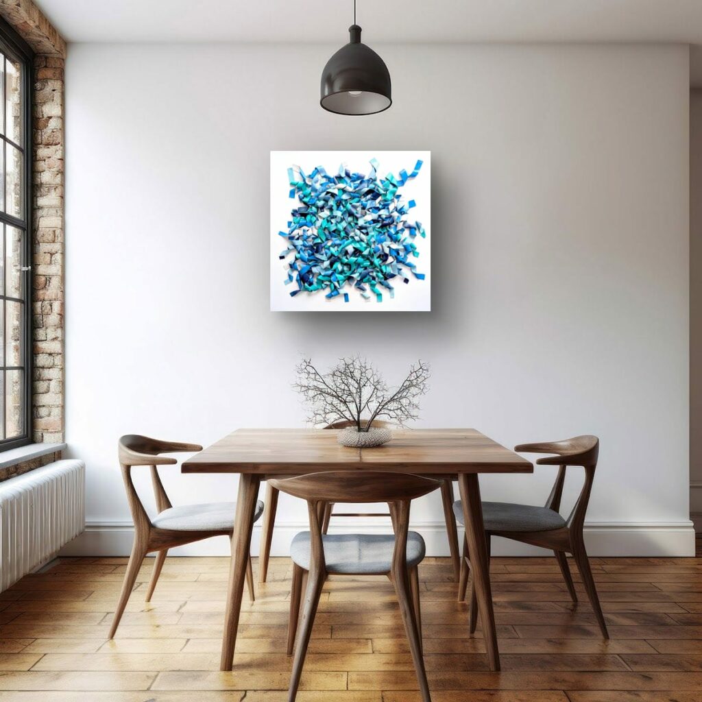 Du bleu marine profond à l’aqua lumineux et au bleu ciel pâle, les nuances créent des micro-contrastes qui insufflent leur rythme interne à la composition. Des plages de blanc ou de bleu très clair agissent comme des respirations, laissant les zones denses jouer les ombres et les replis.