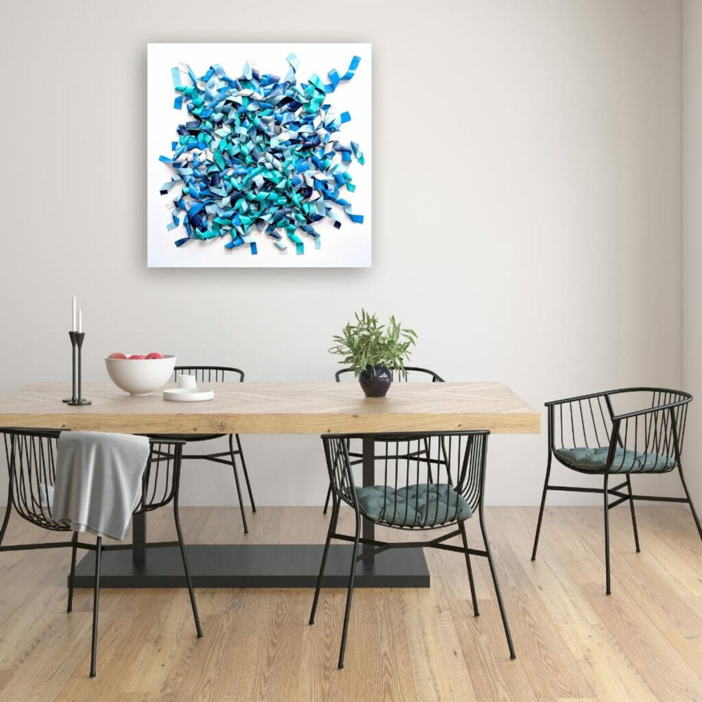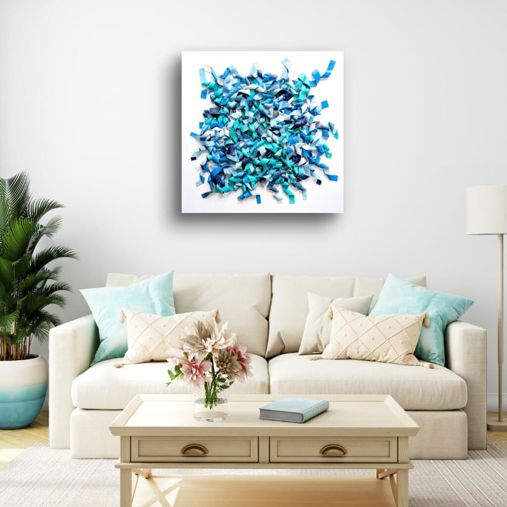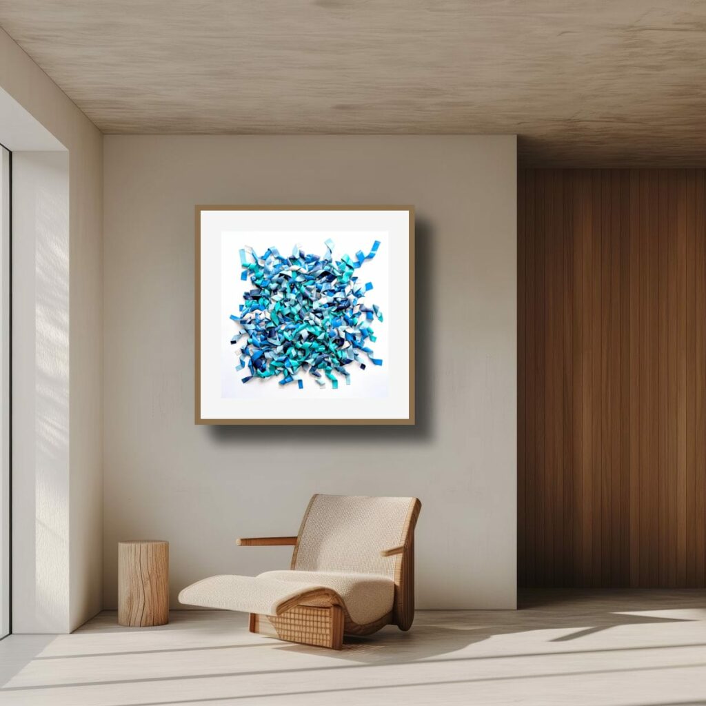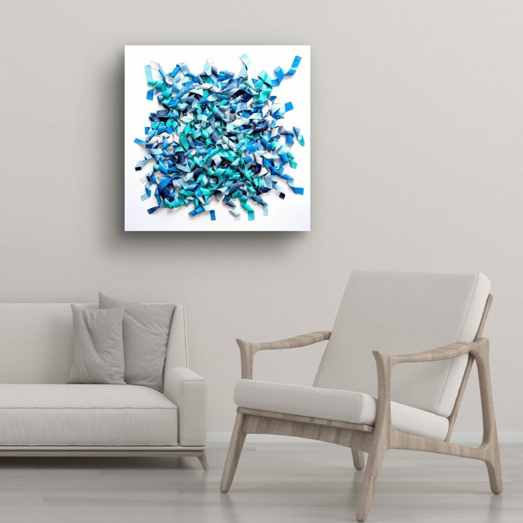 Du bleu marine profond à l’aqua lumineux et au bleu ciel pâle, les nuances créent des micro-contrastes qui insufflent leur rythme interne à la composition. Des plages de blanc ou de bleu très clair agissent comme des respirations, laissant les zones denses jouer les ombres et les replis.