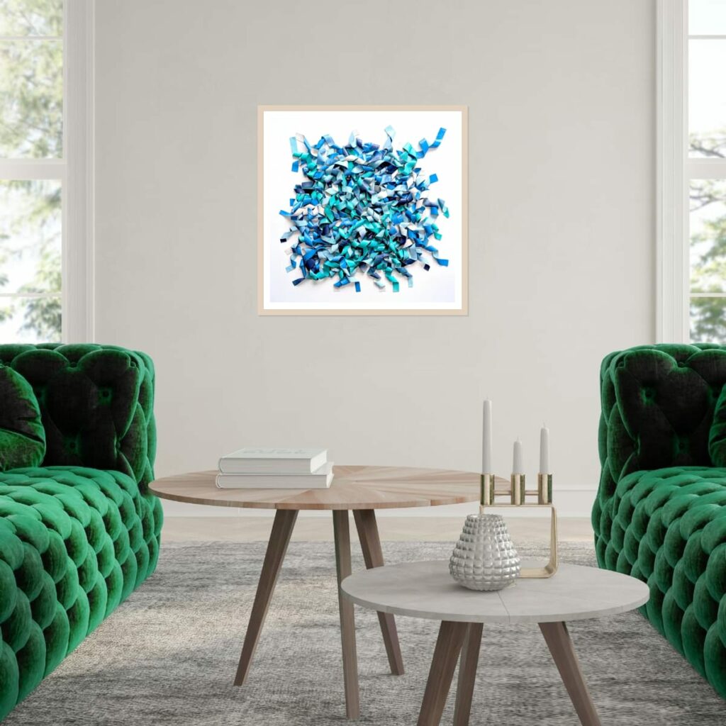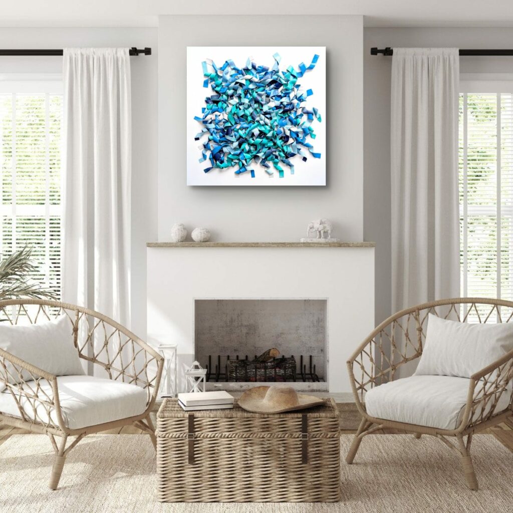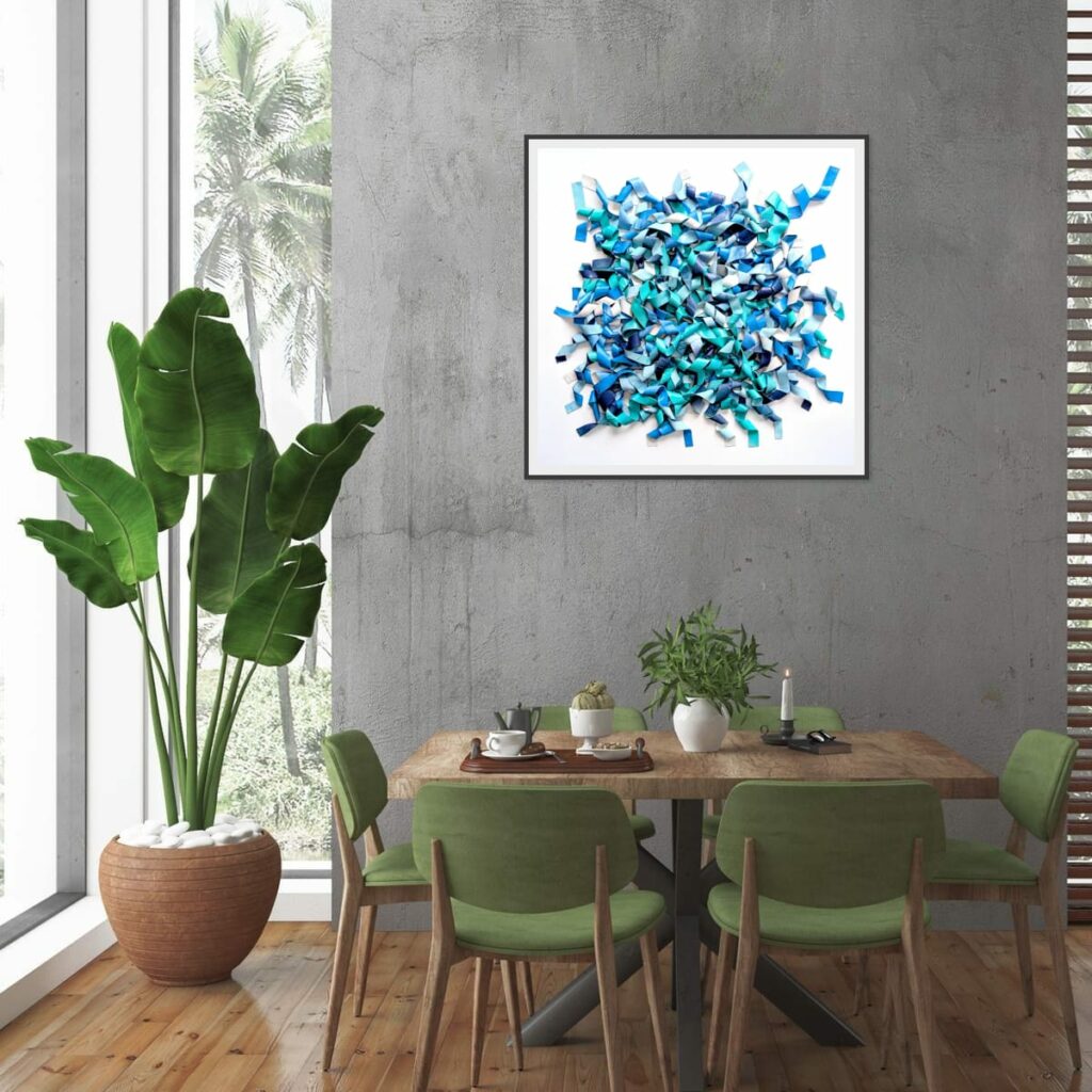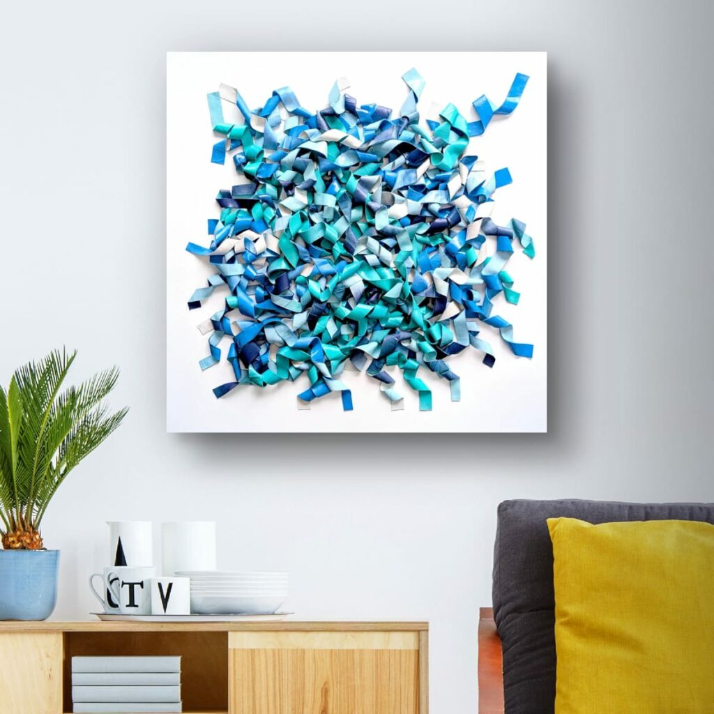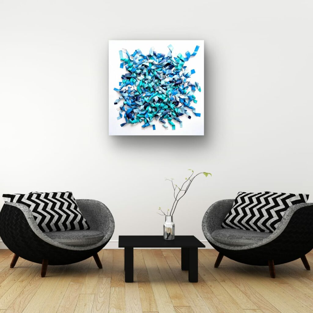 Du bleu marine profond à l’aqua lumineux et au bleu ciel pâle, les nuances créent des micro-contrastes qui insufflent leur rythme interne à la composition. Des plages de blanc ou de bleu très clair agissent comme des respirations, laissant les zones denses jouer les ombres et les replis.