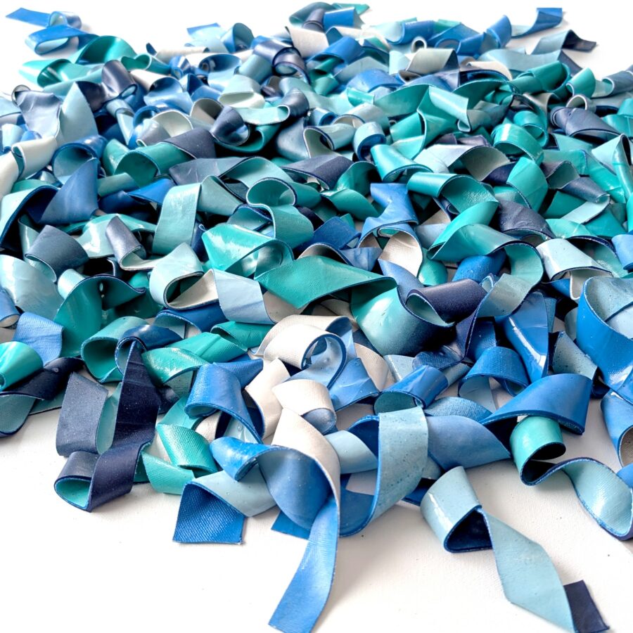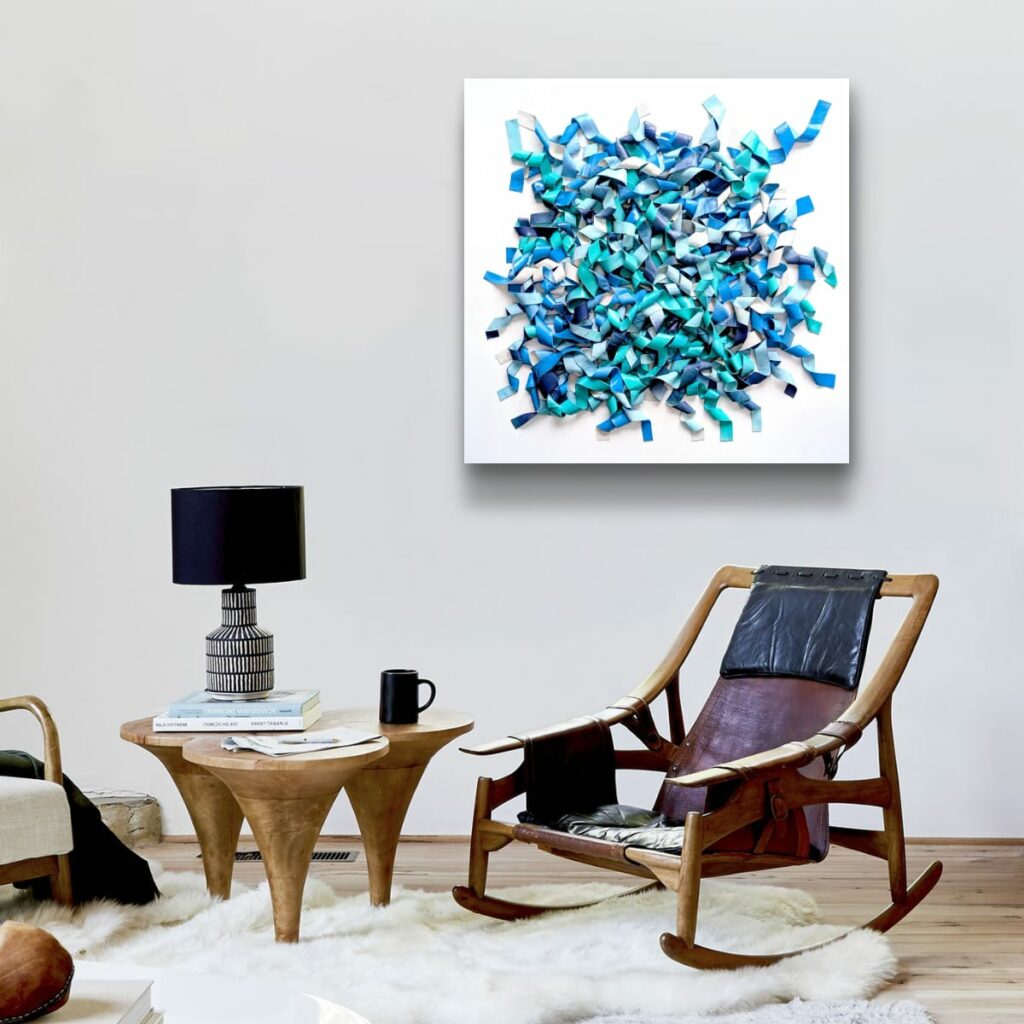 À première vue, l’œuvre se présente comme un jeu espiègle de formes rubanées ,boucles serrées et anses languissantes dans un chœur de bleus et d’eau turquoise. Puis, progressivement, elle se métamorphose : un courant tissé apparaît, la surface texturée d’une mer se révèle, une chorégraphie en mouvement figée dans l’immobilité.