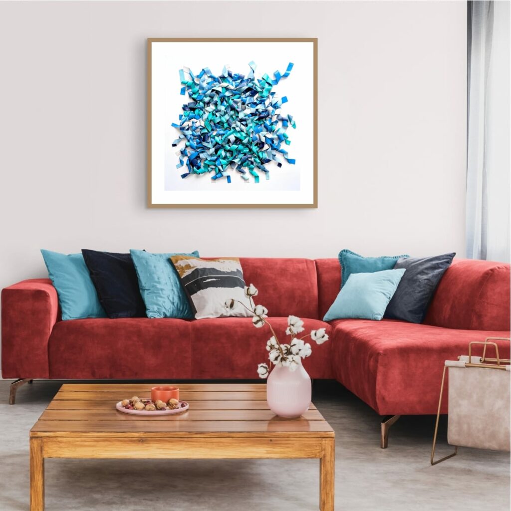 Centrée au-dessus d’un canapé bas ou d’une console, elle structure l’espace horizontalement. Dans un couloir ou une cage d’escalier, plusieurs œuvres alignées créeront une séquence fluide.